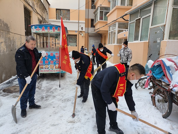 清雪现场,由于天冷路滑,给清扫冰雪造成很大的困难,的士志愿者们不畏严寒,齐心协力,全力以赴投入到清雪工作中,志愿者们戴上手套,手持铁锹、扫帚、推雪板等工具,争分夺秒的清理积雪和冰面,保障居民正常出行。大家顶着寒风,连铲带扫,不畏寒冷,发扬不怕吃苦的精神,干劲十足。志愿者们分工合作,经过通过三个多小时的努力,12个自管庭院积雪全部清理完毕,居民的出行安全得到有效保障。