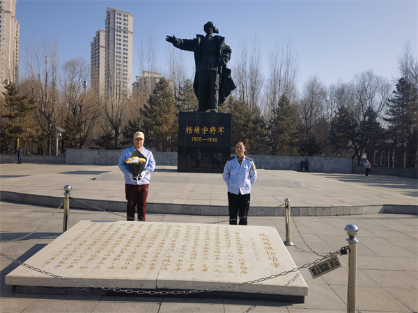 为杨靖宇烈士广场打扫卫生并献花以此致敬英雄,杨靖宇烈士的雕像庄严肃穆,仿佛在诉说着那段波澜壮阔的历史。