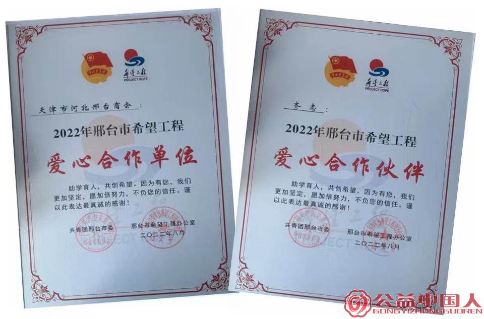 助学育人,共创希望。在大家的积极参与下,不仅公益中国人邢台工作站被授予“2022年邢台市希望工程‘爱心合作单位’”,天津市河北邢台商会和齐志同志也同时被授予“2022年邢台市希望工程‘爱心合作单位’和‘爱心合作伙伴’”。