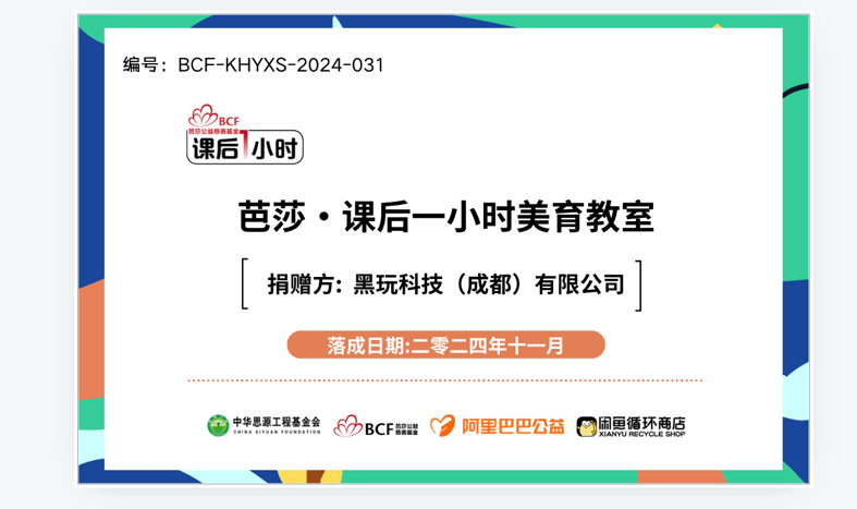 2024年 9月,HEYONE黑玩携手芭莎公益、阿里巴巴公益及闲鱼发起“潮爱出发”公益活动,将旗下人气IP MIMI「自然诗」盲盒系列部分收益,精准注入四川康定乡村美育,改造“课后一小时”美育教室。